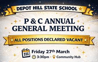 The P & C Annual General Meeting will be held next month on the 27th March at 3.30pm in the Community Hub. All executive positions will be vacated so please consider whether you could commit to being in our P & C. If you are interested to know that this entails, please feel free to drop into the office to discuss.